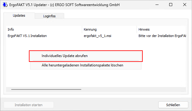 ErgoFAKT-Updater mit Liste verfügbarer UpdatesDie Installation selbst kann dann mit einem Doppelklick auf den entsprechenden Eintrag oder über einen Klick auf den Button "Installation starten" ausgeführt werden.