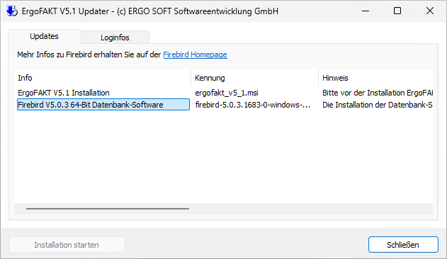 Liste mit verfügbarem Update für FirebirdFirebird kann dann ebenfalls über einen Doppelklick oder über den Button "Installation starten" installiert werden.