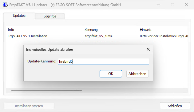 Abruf individueller Updates mit ErgoFAKT-Updaterund tragen Sie unter Update-Kennung "firebird3" ein.