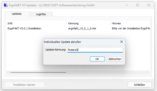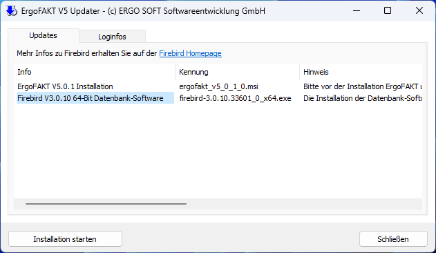 Über dieses Feature kann z.B. die für den Betrieb von ErgoFAKT V5 auf dem Hauptrechner/Server erforderliche Datenbanksoftware Firebird installiert bzw. aktualisiert werden.
